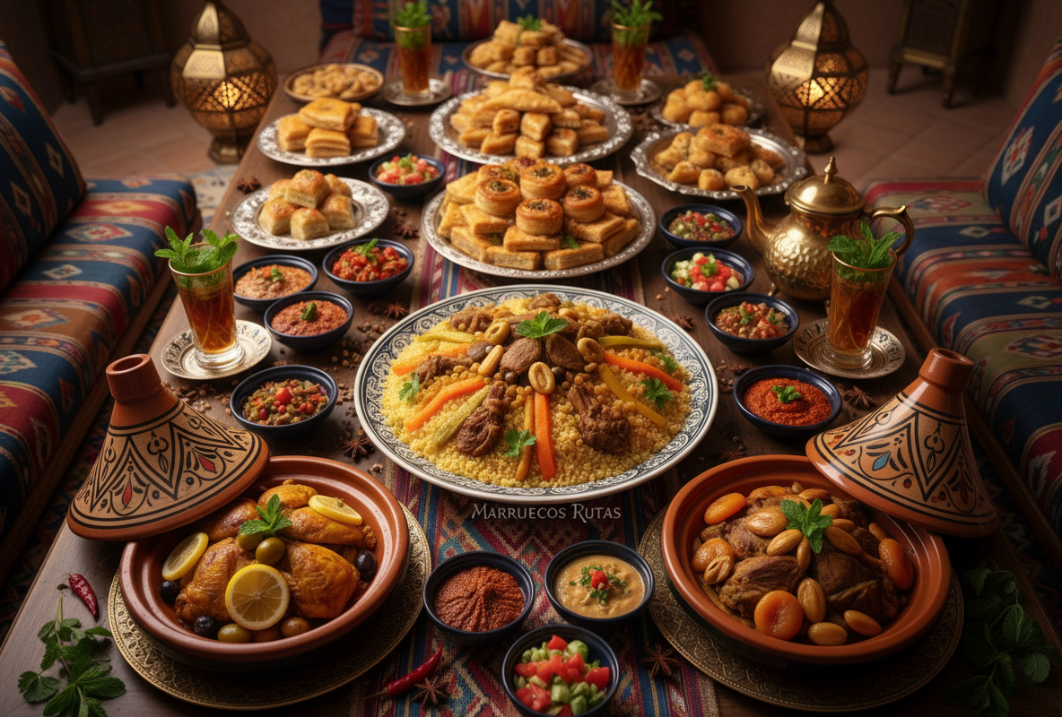 La gastronomía marroquí mezcla culturas, ofreciendo una experiencia única. Combina influencias árabes, bereberes y mediterráneas. Esto hace que los sabores sean variados y ricos.
